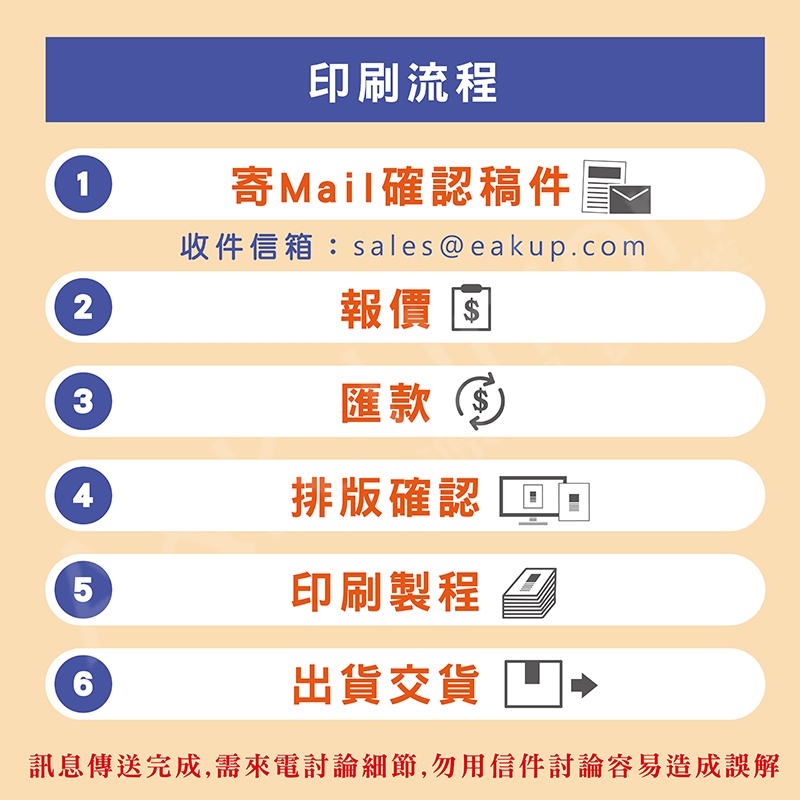 1. 確認稿件:客人自備圖檔(ai檔最佳),如無專業檔,可先電話人工確認圖樣,是否能夠承接印刷